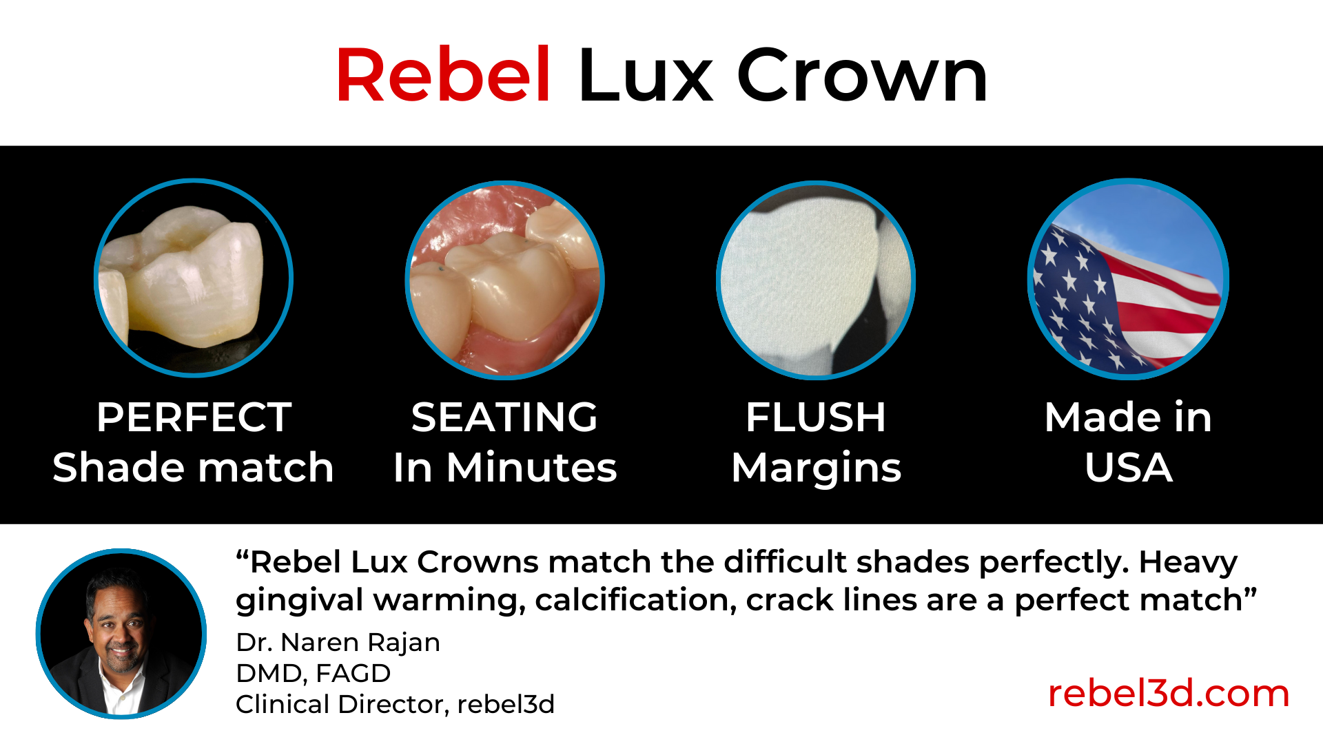 Rebel Lux Crowns are precision milled with polished contacts & custom ceramic colors and stains to match your design file and photos exactly.